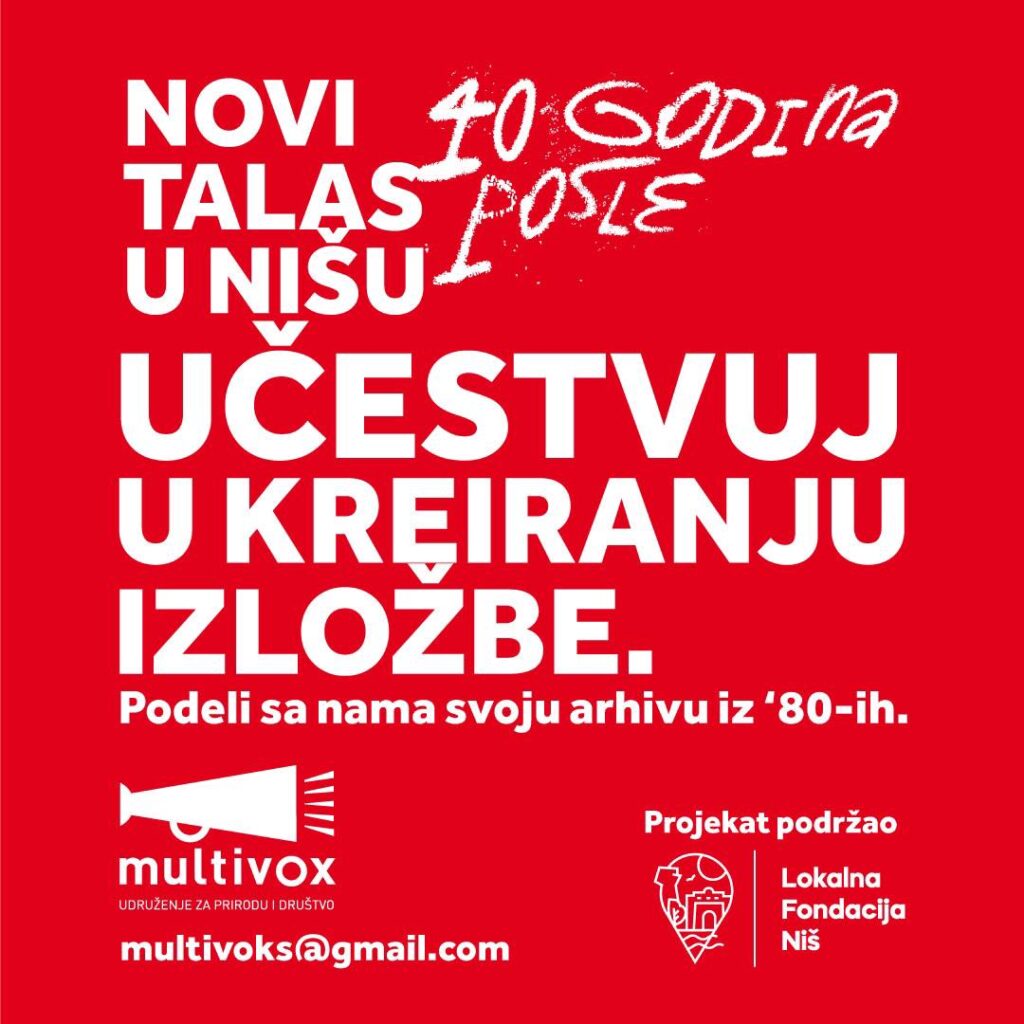 Udruženje za prirodu i društvo Multivoks iz Niša poziva sve zainteresovane aktere, hroničare popularne umetnosti iz perioda 80-ih, posmatrače, prijatelje, građanke i građane, da aktivno učestvuju u kreiranju izložbe „Novi talas u Nišu – 40 godina posle“ i podele javno svoju privatnu arhivu i lična sećanja u formi autorskih fotografija, audio i video zapisa, plakata, stripova, fanzina, tekstova.